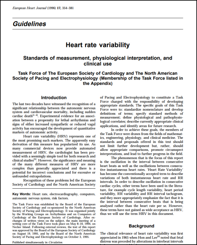 1996年,歐洲心臟學(xué)會(ESC)與北美起搏與電生理學(xué)會(NASPE)工作小組定義并確立了心率變異的測量標(biāo)準(zhǔn)、生理關(guān)聯(lián)性和臨床應(yīng)用范圍